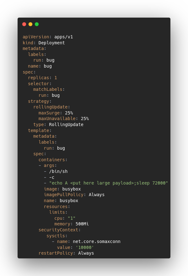 Upon inspection, you’ll notice that its payload is intentionally large, capable of reaching up to 1.5MiB (depending on the etcd system limits), and it sets an unsafe sysctl ( https://kubernetes.io/docs/tasks/administer-cluster/sysctl-cluster/#safe-and-unsafe-sysctls ). Because the kubelet is not configured to support this specific unsafe sysctl, it marks the pod as failed and triggers the bug.