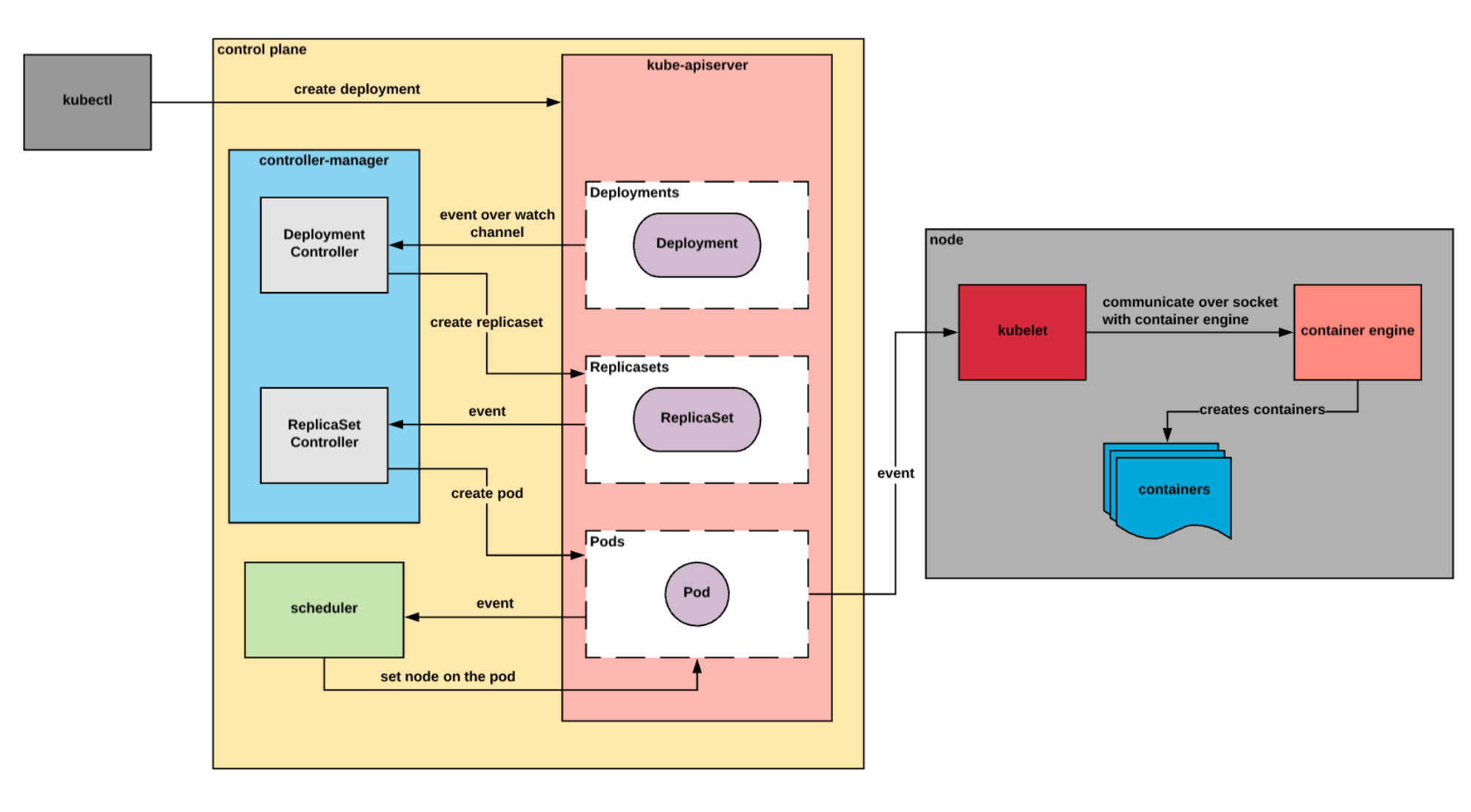 First, the deployment is translated into ReplicaSets. Then, the ReplicaSet controller translates its definition into pods. Once the pods are created, the scheduler controller determines where the pods should be deployed. Finally, another controller - kubelet ensures that the pod is created on the target node and updates its status with the result.